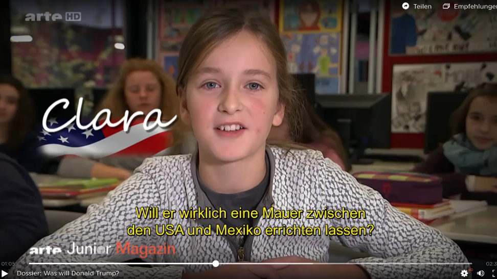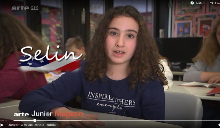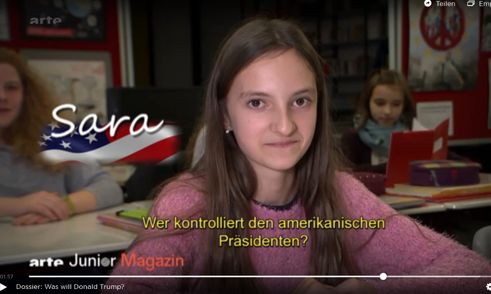 Es ist bereits eine schöne Tradition geworden, dass der deutsch-französische TV-Sender ARTE das HFG besucht. Dieses Mal stellten die Schülerinnen und Schülern des Französischkurses 6abdPlus auf Deutsch und Französisch Fragen zu einem aktuellen politischen Thema, das selbst an den 11-12jährige nicht vorbeigegangen ist: "Donald Trump, was nun?" Im Vorfeld hatten sie die Fragen mit Hilfe ihrer Eltern und ihrer Französischlehrerin erarbeitet. ARTE hat daraus einen Beitrag für sein Journal Junior produziert, der unter diesem Link auch online abrufbar ist.