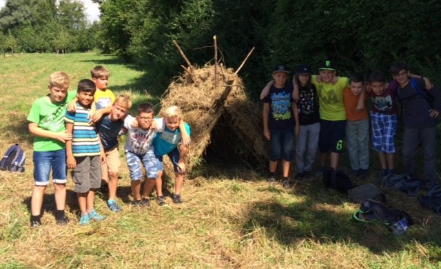 5a beim Biwak-Bauen und Spurensuchen beim Trappertag in Rust