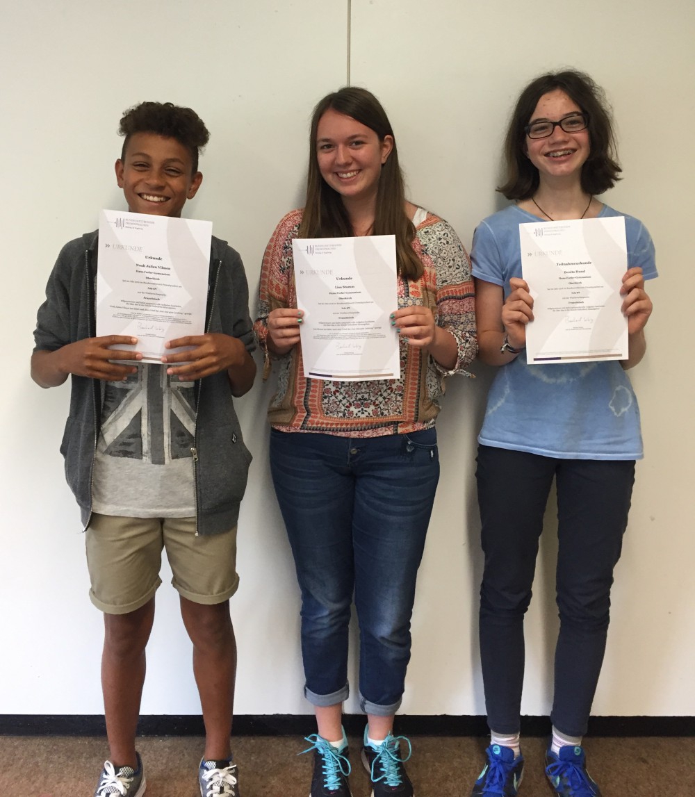 Nach einigen Monaten des Wartens sind nun die erfolgreichen Ergebnisse und mit ihnen auch die Urkunden für die drei Schüler in Oberkirch eingetroffen. Erfreulicherweise gelang es Lisa Stumm, Klasse 8c (Foto: Mitte), mit ihren Leistungen einen hervorragenden 3. Landespreis zu gewinnen. Am 7. Juli ist sie zur Landespreisverleihung ins schwäbische Korntal-Münchingen eingeladen, um ihren Preis in Empfang zu nehmen. Herzlichen Glückwunsch!