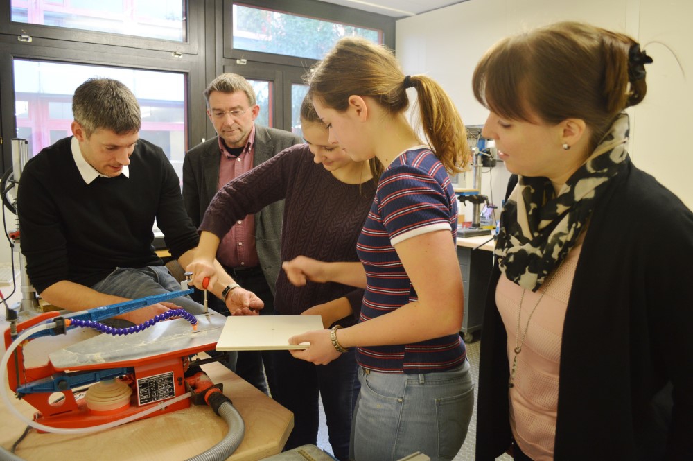 Neben den am allgemeinbildenden Gymnasium traditionell vertretenen Naturwissenschaften rückt die Technik und Elektronik hauptsächlich im Profilfach NwT immer stärker in den Fokus. Etliche Unterrichtseinheiten im Fach NwT, wie z.B. Kranbau, Lautsprecherbau, Fahrgestellbau für elektronische Schaltungen, aber auch der Technik-Club der Unterstufe erfordern den Einsatz von Maschinen zur Herstellung der entsprechenden Werkstücke. Für dieses Schuljahr wurde hierfür ein neuer Maschinenraum eingerichtet. Die Firma Ruch Novaplast ermöglichte die Anschaffung zusätzlicher Dekupiersägen mit zugehörigem Absaugsystem (siehe Foto).