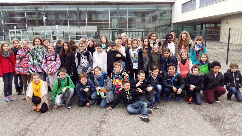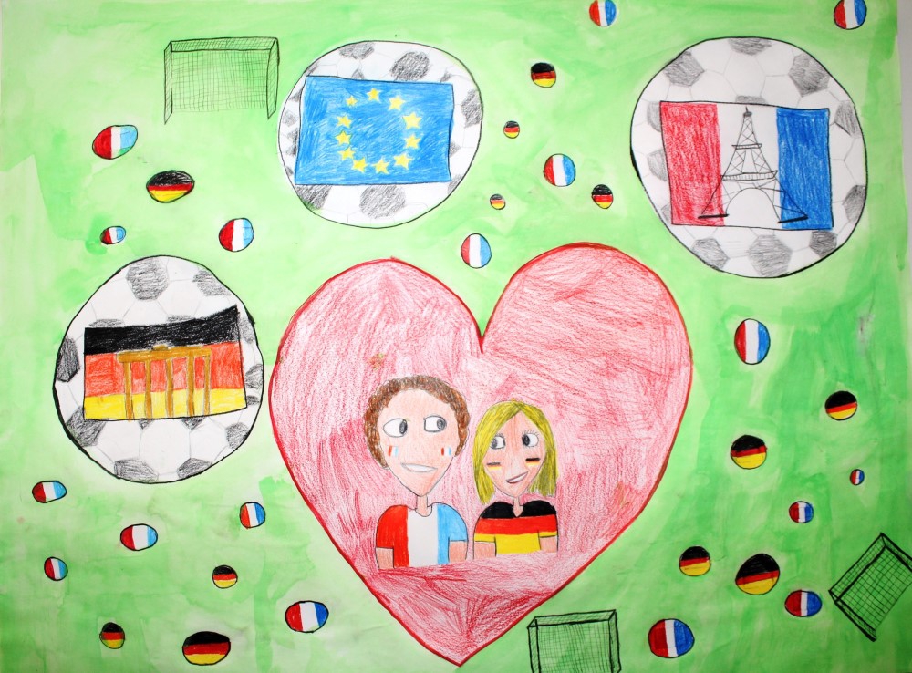 Die Schüler des Französischkurses 6ace trafen am Collège Galilée in Lingolsheim, seit vielen Jahren Partnerschule des HFG, zum ersten Mal ihre französischen "Corres". Im Vorfeld wurden bereits Briefe ausgestauscht. Nun ging es zu einem Projekttage über den Rhein ins nahe Lingolsheim. Nach einer Vorstellungsrunde auf Französisch lernten sich die Schülerinnen und Schüler mit Hilfe eines von den Lehrkräften ausgearbeiteten deutsch-französischen Fragebogens besser kennen. Der Fragebogen diente auch zur thematischen Vertiefung der im Unterricht erarbeiteten Kenntnisse über den französischen bzw. deutschen Schulalltag. Im Mittelpunkt der Projektarbeit stand dann das gemeinsame Anfertigen deutsch-französischer Fahnflaggen für die Fußball-Europameisterschaft 2016 in Frankreich. Die entstandenen Produkte bilden Beiträge für einen Wettbewerb, den das Deutsch-Französische Jugendwerk und der Deutsche Fußball-Bund ausgeschrieben haben.