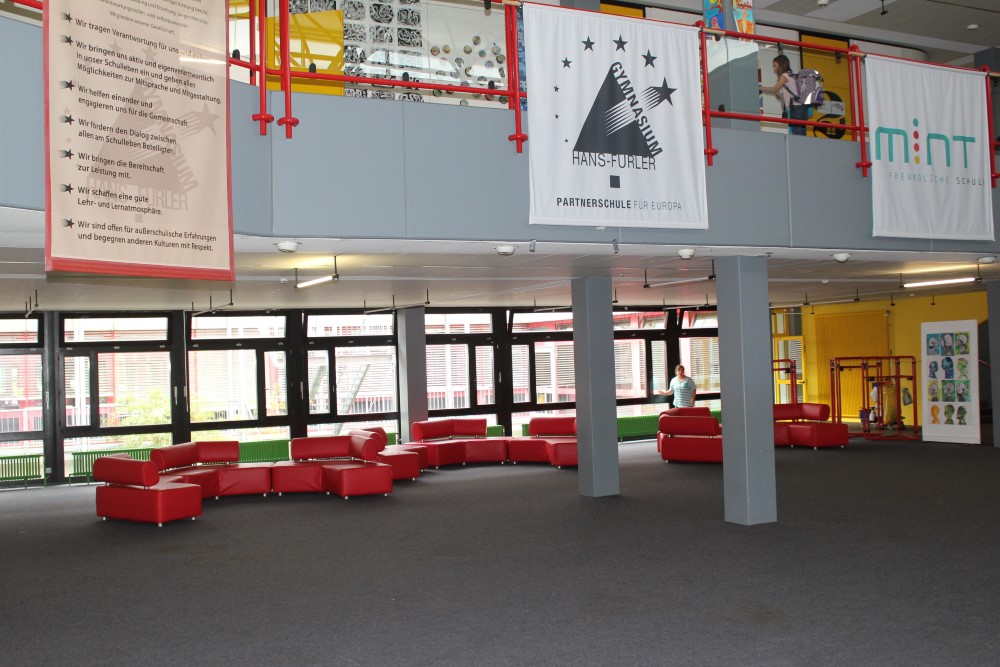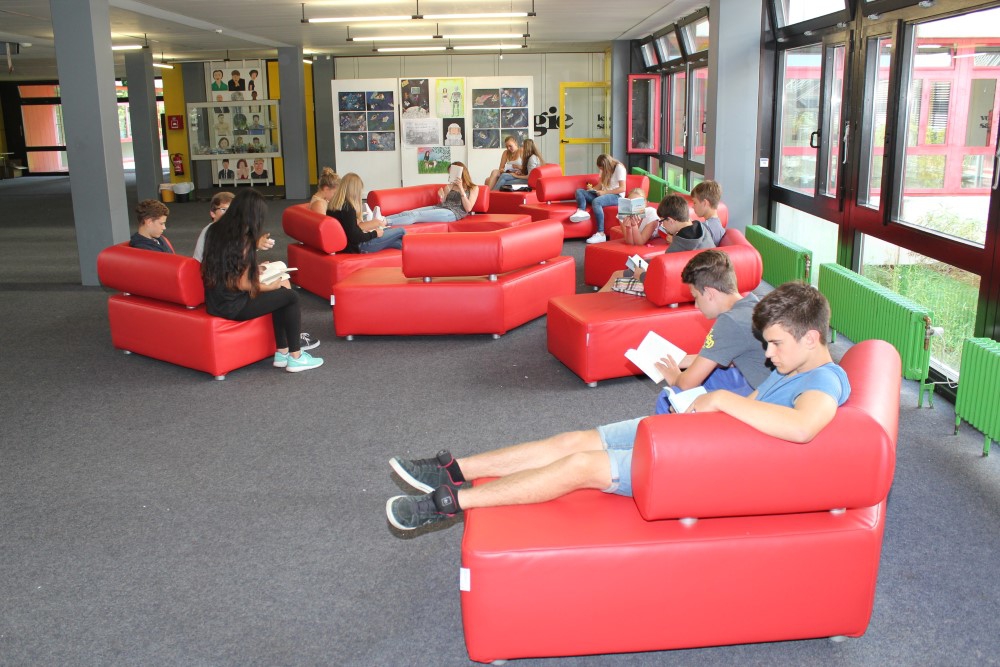 Der Auswärtigenraum dient bereits seit einigen Monaten als Aufenthaltsbereich der Mittelstufe. Nun wurden für den hinteren Bereich des Pädagogischen Zentrums hochwertige Sitzmöbel eines renommierten Schulausstatters angeschafft. Diese Möbel wurde eigens für schulische Zwecke kreiert. Sie sind robust, erfüllen alle Auflagen des Brandschutzes und erlauben der Schülerschaft nicht nur zu "relaxen", sondern fördern durch ihre besondere Form auch die Kommunikation.