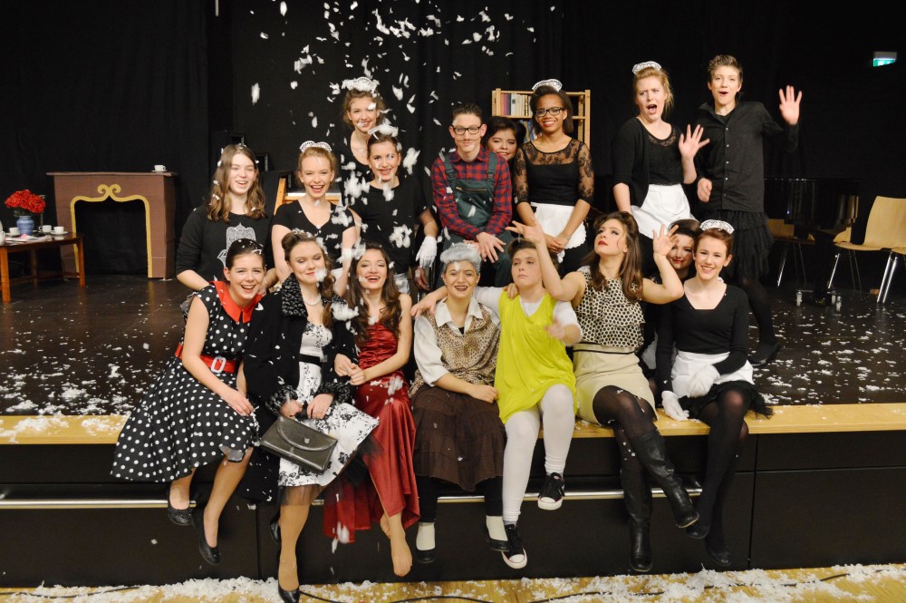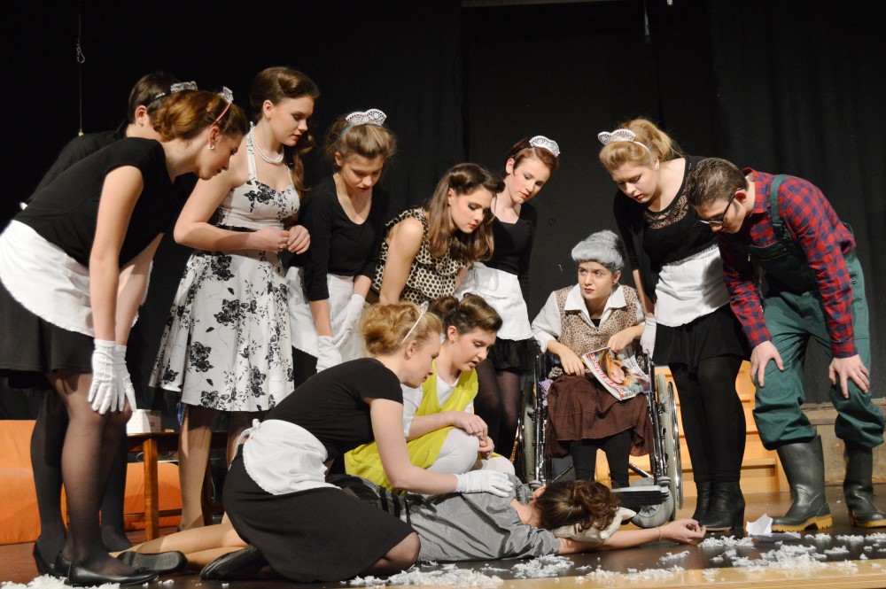 Großes französisches Kino führte die Theaterwerkstatt des Hans-Furler-Gymnasiums unter der Leitung von Judith Niesert-Falcoz mit dem Stück „Acht Frauen“, nach dem Drehbuch „Huit Femmes“ von Robert Thomas, an zwei Abenden im Forum der Gymnasiums auf. Die Frauen, die sämtliche Vorurteile und Klischees bedienen, treffen sich, nachdem der Hausherr erstochen in seinem Bett aufgefunden worden ist, in der winterlichen Abgeschiedenheit seines französischen Landhauses. Wer von ihnen war die Mörderin, wer profitiert am meisten von dem Mord, wer hat das stärkste Motiv?