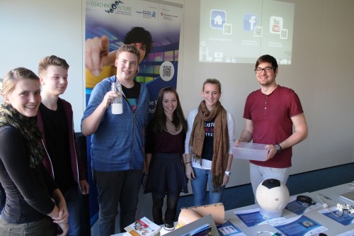 In einer multimedialen Präsentation wurden die Jugendlichen über aktuelle und zukünftige Produkte und Verfahren informiert. Exponate wie z.B. eine Prothese, die sich durch die Nerven steuern lässt, veranschaulichten einige dieser innovativen Entwicklungen. Um den Schülerinnen und Schülern eine Hilfestellung in der Studien- und Berufswahl zu geben, zeigten die Coaches, welche Berufsgruppen an der Realisierung der vorgestellten Produkte mitarbeiten und wie vielseitig diese Tätigkeiten sind. Ob Unterhaltung und Kommunikation oder Gesundheit und Umweltschutz – aus sechs Themenwelten wählten die Jugendlichen ihre Favoriten aus und bestimmten somit selbst den Schwerpunkt der Informationsveranstaltung. Schließlich sollten im Zentrum der Berufsorientierung immer die eigenen Interessen und Stärken stehen. Auf diese Weise gaben die Coaches den Jugendlichen das Werkzeug an die Hand, auch ihre eigene berufliche Zukunft zu gestalten.