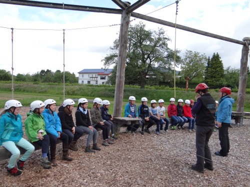 Die Klasse nahm an einem Teamtraining teil, bei welchem auf spielerische Art und Weise soziale Kompetenzen gestärkt wurden. Um die verschiedenen Teamspiele zu meistern, musste man unter anderem miteinander reden, sich absprechen, aufeinander Rücksicht nehmen und sich auf den anderen verlassen können. Im Parcours waren dann auch noch Motorik und Geschicklichkeit gefragt, aber allein konnte man diesen nicht durchlaufen. Die beliebtesten Stationen waren die Reifenringe und die sogenannte „ Sanduhr“, bei welcher man auf beweglichen Seilen von einer auf die andere Seite gelangen musste.
