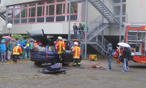 Am eigentlichen Aktionstag haben Rettungskräfte der Feuerwehr und des Deutschen Roten Kreuzes über das Verhalten im Notfall informiert. Dabei wurde den Schülern beispielsweise gezeigt, wie ein Notruf abgesetzt wird und wie man auch als Laie Verletzte aus einem Unfallfahrzeug bergen und in die stabile Seitenlage bringen kann. Auch die Rettung einer in einem Auto eingekeilten Person wurde eindrucksvoll demonstriert. Dabei kamen Geräte wie hydraulischer Spreizer und Schere zum Einsatz. Am Ende war die Schülerin, die sich zum Spielen des Opfers bereit erklärt hatte, gerettet und das Auto ohne Dach!
