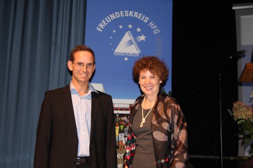 Unter den Feiernden konnte Freundeskreis-Vorsitzende Maria Gerber ihre Vorgänger im Amt Donata Apelt-Ihling und Christian Poetsch sowie Hauptamtsleiter Hermann Brüstle und die HFG-Schulleiter Peter Bechtold und dessen Vorgänger Thomas Steiner begrüßen. Der Freundeskreis wirke sich als Teil der Schulfamilie in Bereichen, die über den Lehrplan hinausgingen, sagte Gerber. Das Spektrum der Initiativen fächert sich auf in der Schulgalerie "Der Künstler kommt zum Schüler", Podiumsdiskussionen zu verschiedenen Themen, Schulpaten und -partnerschaften, die jährlich wiederkehrenden Unternehmungen wie Skilandschulheim, Musikfreizeiten, Theater AG, Literaturshop, Ausstattung der Technik AG, die Erstellung der Jahresschrift sowie der Abiturpreis.