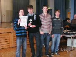 Wieder einmal wurde ein Schachteam des HFG Bezirksmeister. Dabei waren in diesem Jahr die Voraussetzungen längst nicht optimal. Man musste im WK I antreten, obwohl drei der vier Spieler noch in WK II spielberechtigt waren und die aktuelle Nummer 1 des HFG (Viktoria Braun) nicht dabei war. Trotzdem setzten sich Tobias Wiegert, Tim Litwin, Pascal Huber und Manuel Fiegel mit drei Siegen gegen die Gymnasien aus Offenburg (Grimmelshausen), Rheinau (1 u. 2) und ein Remis gegen das Scheffel aus Lahr durch und qualifizierten sich dadurch für das RP-Finale (Text/Foto: Schwab)
