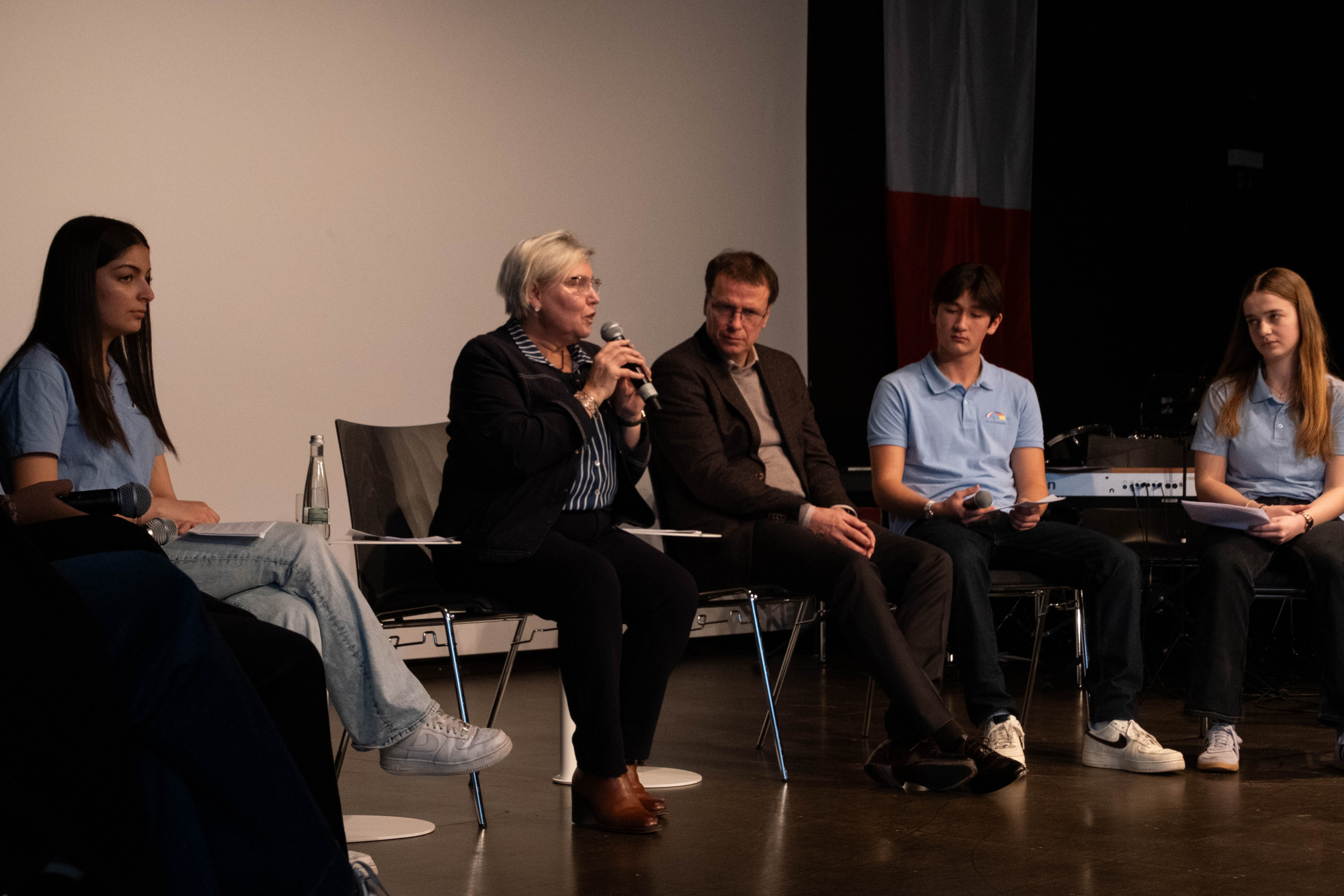 Die Veranstaltung ließ auch kritische Fragen zur Lage der deutsch-französischen Beziehungen zu. Staatssekretär Volker Schebesta, einst selbst Absolvent des HFG, und Schulinspektorin Isabelle Wolf (Académie de Strasbourg) stellten sich den Fragen der deutsch-französischen Schülerbotschafter, darunter auch solchen des Oberkircher Gymnasiums. Im Mittelpunkt standen der Platz der jeweiligen Nachbarsprache im Unterricht und die Frage, wie europäische Identität entstehen kann. Außerdem ging es um die Rolle von Frankreich und Deutschland in einer Welt, in der autoritäre Herrschaft an Boden gewinnt.