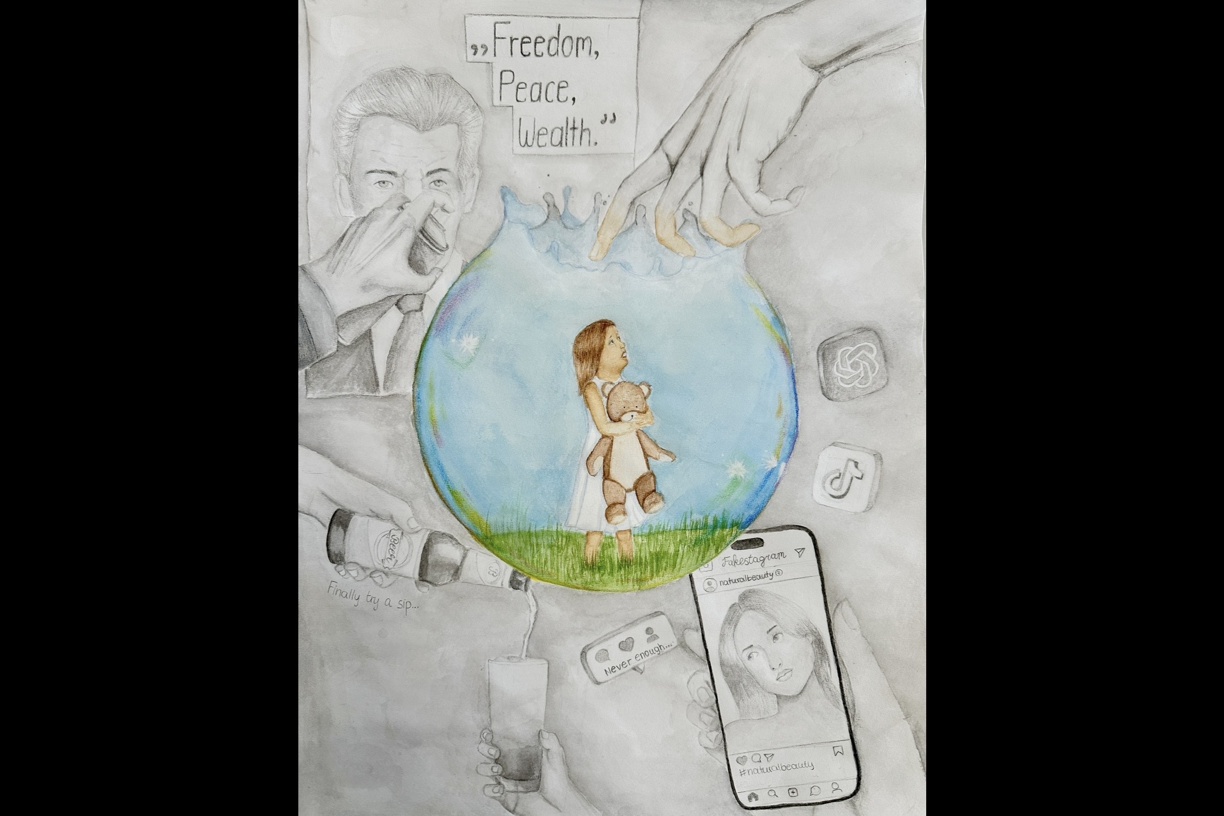 In diesem Jahr haben sich Schülerinnen und Schüler der 10b und eine Schülerin aus der J1 künstlerisch mit den Themen des 73. Europäischen Wettbewerbs auseinandergesetzt. Das übergeordnete Motto des Wettbewerbs war „Dein Europa: Recht, Respekt – Realität?“ Trotz der geringeren Teilnahme als üblich, dürfen wir 6 Preisträger*innen beglückwünschen: Angelina Bosnjak, Sofia Hirt und Eliot Schöning (10b) haben mit einem selbstkomponierten Song zum Wettbewerbsthema „Klare Stimme – offenes Ohr“ einen Ortspreis gewonnen. Lisa-Marie Niederer (10b) konnte mit ihrem Bild zum Thema „Die Gedanken sind frei“ einen Landespreis mit Bundespreisnominierung erringen. Auch Sophie Birk (J1) hat sich mit dem Thema „Die Gedanken sind frei“ malerisch auseinandergesetzt und das zweite Jahr in Folge einen Bundespreis bekommen. (Preis der Kultusministerkonferenz 150€ und Buch). In Sara Sofis (10b) Zeichnung spielt das Thema „Gewalt ist keine Option“ eine Rolle. Sie hat damit einen Bundespreis errungen und darf am Ende der Sommerferien gemeinsam mit weiterem Preisträger*innen aus anderen Schulen eine einwöchige Reise antreten. Alle sechs Preisträger*innen dürfen am 18. Juni zur feierlichen Preisverleihung in den Europapark. Wir gratulieren euch!